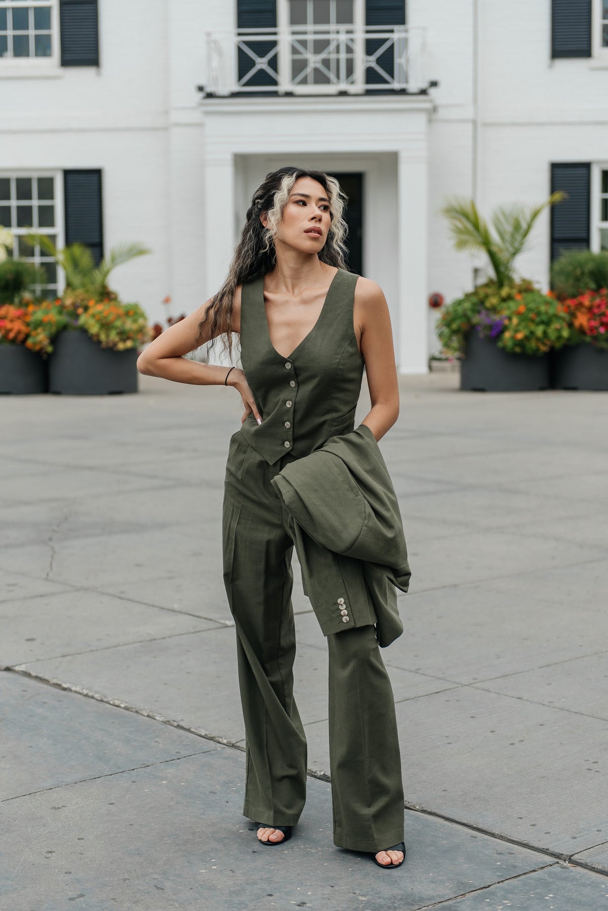 The MOROCCO suit is an ode to the modern woman, a symphony of linen that drapes and moves with unparalleled grace. Designed for those who appreciate the art of understated elegance, this three-piece ensemble is a statement of refined luxury, promising to elevate every occasion with its timeless allure.