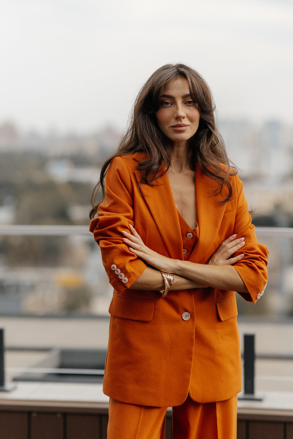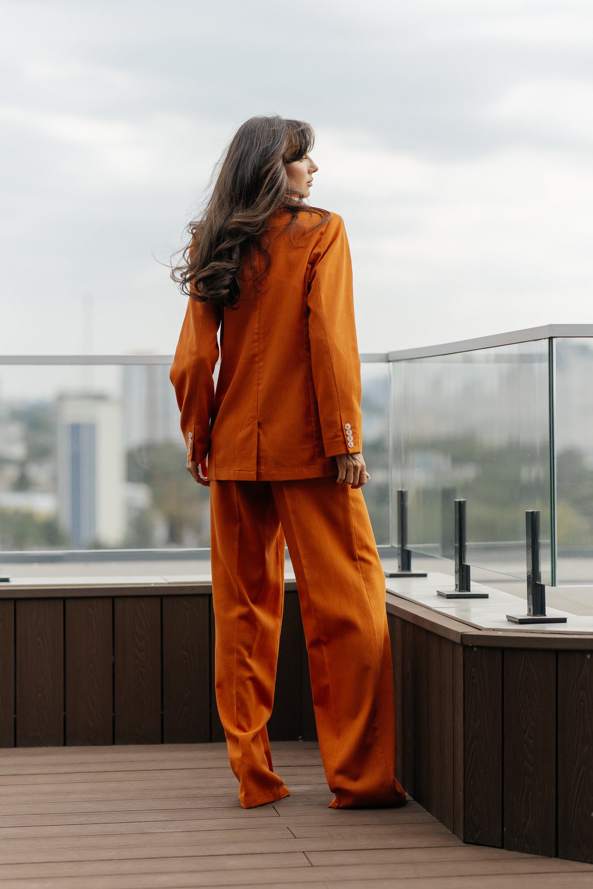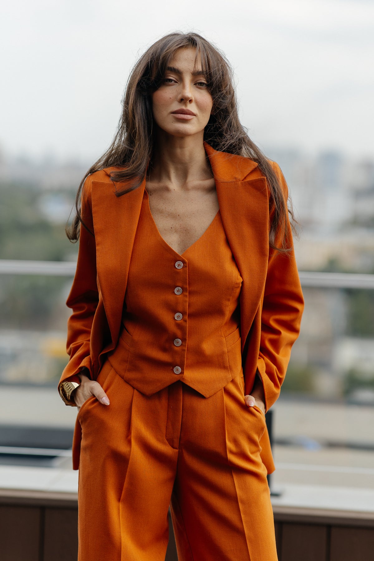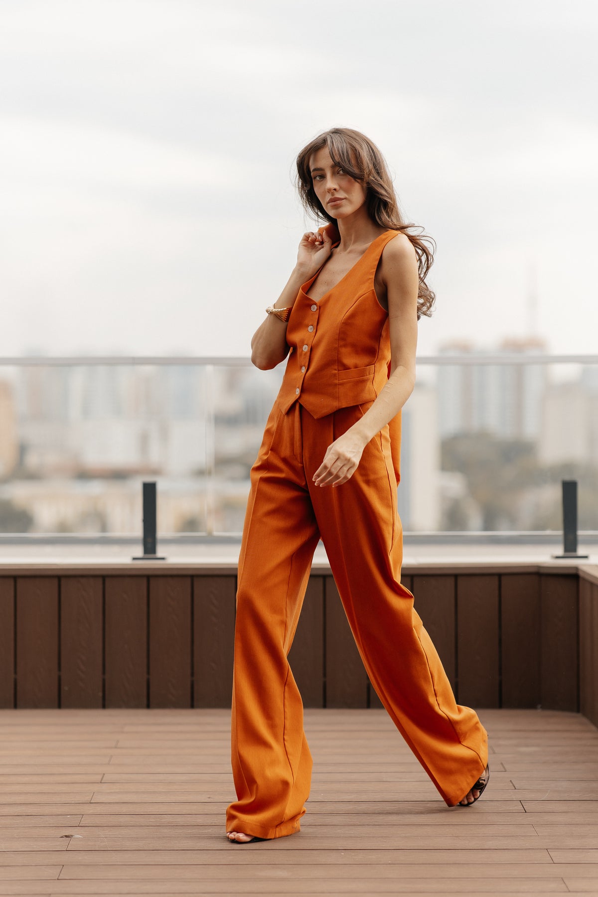 The palazzo pants, a design that flatters every silhouette, cascade from the waist, creating a fluid, elongated line that exudes both comfort and timeless chic. The vest and jacket are precisely tailored to create a perfect fit.